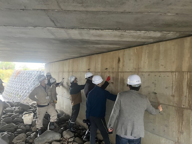 経済学部の学生のため、普段は橋を見るようなことはないのですが、今回はヘルメット・長靴姿で川に降り、橋梁を下から観察しました。ハンマーを使って音を聞き分たり、ひび割れの幅を測ったりと、初めての体験をした後、フィールドワークセンター「ふらりば」にて質疑応答等を行いました。