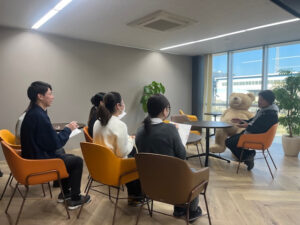 4名の学生が岳南電車に乗り、本吉原駅の隣にある岳南電車株式会社を訪れ、奥田壮一社長にインタビューなどを行いました。